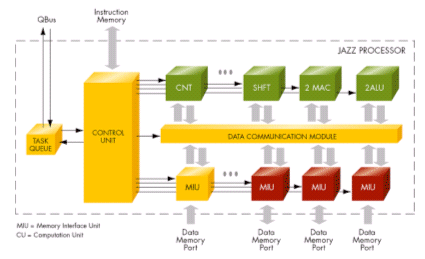 The processor is organized around a central Data Communications Module with a Control Unit and Task Queue to oversee execution sequencing. Depending on the instruction word length which is variable, 1 to n computation units and memory units execute in parallel. The number and type of units is configured as part of the design process. Selection of computation units is provided from a library of standard units such as ALU, MAC, Shift. Specialized units which are really accelerators for commun DSP operations such as FFT, DCT, FIR are also available. A mechanism is provided for designing custom instructions called DDCUs made known to the compiler through a configuration file.