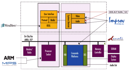 With the addition of interface blocks and standard bus/micro-processor support a subsystem to support media processing may be developed. In the example of the Crescendo system shown, the media processor engines are in the Crescendo Platform and are programmed within the platform programming model. The microprocessors are running legacy code to illustrate how a system can be built up using a combination of the coherent programming model and external units. The ideal future system would have all the units within the progamming model.