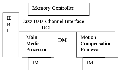 The subsytem for media processing, in this case MPEG4 is shown with its Host Bus Interface (HBI) and its Data Memory (DM) used for inter-processr communication. Since this application requires large quantities of data for the MPEG frame buffers, a high throughput Data Channel Interface is provided to talk to an external memory controller.