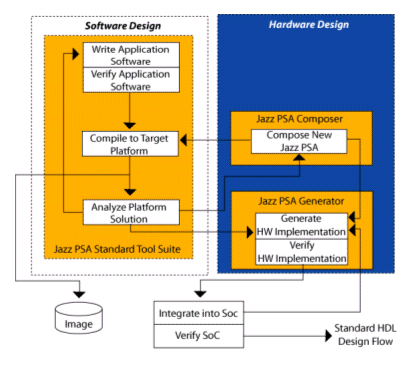 As shown in Figure 4, the platform development environment supports a parallel hardware/software development process with the application as the driver. The application is described in a notation called Notation developed at Improv. It has Java and C based implementation and has a set of class definitions and APIs to supplement the existing language semantics for parallel and hardware related constructs. Ideally a standard system design language would be used but none have yet been adopted.