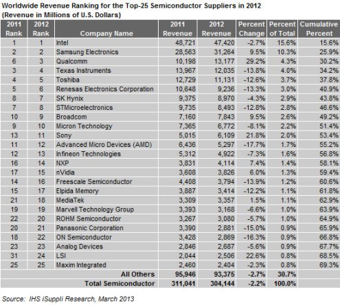 Among the Top 25 suppliers, the only companies to expand revenue in 2012 were No. 2 Samsung, No. 3 Qualcomm, No. 9 Broadcom, No. 11 Sony, No. 14 NXP, No.15 nVidia, No.18 MediaTek and No. 24 LSI.