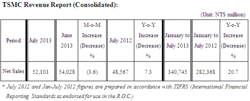 Hsinchu, Taiwan, R.O.C. – Aug 9, 2013 - TSMC (TWSE: 2330, NYSE: TSM) today announced its net revenues for July 2013: On a consolidated basis, reveunues for July 2013 were approximately NT$52.10 billion, a decrease of 3.6 percent from June 2013 and an increase of 7.3 percent over July 2012. Revenues for January through July 2013 totaled NT$340.75 billion, an increase of 20.7 percent compared to the same period in 2012.