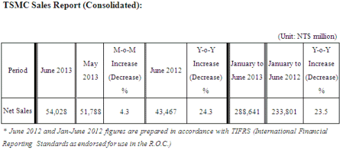 Hsinchu, Taiwan, R.O.C. – July 10, 2013 - TSMC (TWSE: 2330, NYSE: TSM) today announced its net sales for June 2013: On a consolidated basis, net sales for June 2013 were approximately NT$54.03 billion, an increase of 4.3 percent from May 2013 and an increase of 24.3 percent over June 2012. Revenues for January through June 2013 totaled NT$288.64 billion, an increase of 23.5 percent compared to the same period in 2012.