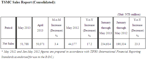 Hsinchu, Taiwan, R.O.C. – June 10, 2013 - TSMC (TWSE: 2330, NYSE: TSM) today announced its net sales for May 2013: On a consolidated basis, net sales for May 2013 were approximately NT$51.79 billion, an increase of 3.4 percent from April 2013 and an increase of 17.2 percent over May 2012. Revenues for January through May 2013 totaled NT$234.61 billion, an increase of 23.3 percent compared to the same period in 2012.