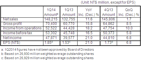 Hsinchu, Taiwan, R.O.C., April 17, 2014 -- TSMC today announced consolidated revenue of NT$148.22 billion, net income of NT$47.87 billion, and diluted earnings per share of NT$1.85 (US$0.31 per ADR unit) for the first quarter ended March 31, 2014.
