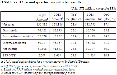 Hsinchu, Taiwan, R.O.C., July 18, 2013 – TSMC today announced consolidated revenue of NT$155.89 billion, net income of NT$51.81 billion, and diluted earnings per share of NT$2.00 (US$0.33 per ADR unit) for the second quarter ended June 30, 2013.