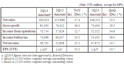 Hsinchu, Taiwan, R.O.C. -- July 16, 2014 -- TSMC today announced consolidated revenue of NT$183.02 billion, net income of NT$59.7 billion, and diluted earnings per share of NT$2.3 (US$0.38 per ADR unit) for the second quarter ended June 30, 2014.