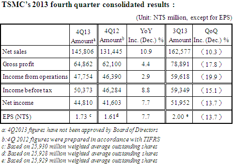 Hsinchu, Taiwan, R.O.C., January 16, 2014 –TSMC today announced consolidated revenue of NT$145.81 billion, net income of NT$44.81 billion, and diluted earnings per share of NT$1.73 (US$0.29 per ADR unit) for the fourth quarter ended December 31, 2013.