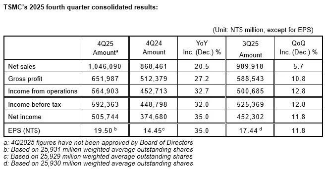 HSINCHU, Taiwan, R.O.C., Jan. 15, 2026 -- TSMC (TWSE: 2330, NYSE: TSM) today announced consolidated revenue of NT$1,046.09 billion, net income of NT$505.74 billion, and diluted earnings per share of NT$19.50 (US$3.14 per ADR unit) for the fourth quarter ended December 31, 2025.