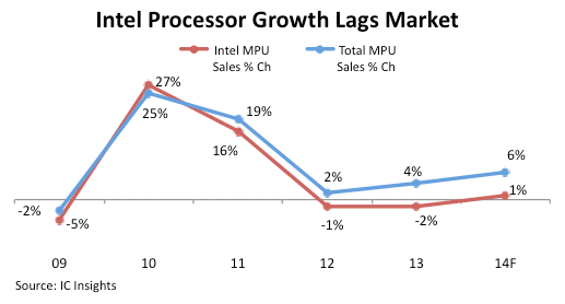 The unprecedented x86 MPU design partnership with Rockchip—a leading Chinese supplier of competing ARM-based processors—is the latest bold move by Intel to change its approach to new markets, boost sales growth, and finally get in step with major trends reshaping the IC industry since the turn of the century. Intel—still joined at the hip with slumping x86-based personal computers—saw its MPU marketshare slide to 62% in 2013 ($36.3 billion) from nearly 70% five years ago. Intel’s microprocessor sales continue to lag market growth despite years of efforts to become a major player in tablets and smartphones (see Figure 1).