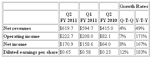 SAN JOSE, Calif., Oct 20, 2010-- Xilinx, Inc. (Nasdaq: XLNX) today announced second quarter fiscal 2011 sales of $619.7 million, up 4% sequentially and up 49% from the second quarter of the prior fiscal year. Second quarter fiscal 2011 net income was $170.9 million, or $0.65 per diluted share.