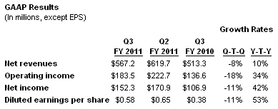 SAN JOSE, Calif., Jan. 19, 2011 -- Xilinx, Inc. today announced third quarter fiscal 2011 sales of $567.2 million, down 8% sequentially and up 10% from the third quarter of the prior fiscal year. Third quarter fiscal 2011 net income was $152.3 million, or $0.58 per diluted share.