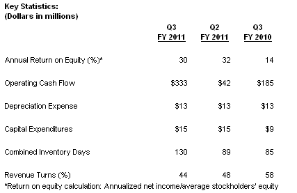 "While we did not achieve a fifth consecutive quarter of record sales, I am pleased with the Company's continued focus on cost reduction and financial discipline. This is reflected in gross margin and operating margin of 65.7% and 32%, respectively, in the December quarter. This is up from 64.1% and 27% in the same quarter of the prior year," said Moshe Gavrielov, Xilinx President and Chief Executive Officer. "As we embark upon 2011, I am encouraged by initial manufacturing milestones we have achieved on the new 28nm technology node. When coupled with the competitive advantages offered by our 7 series FPGAs, I believe Xilinx is positioned to establish clear market share leadership on this technology node."